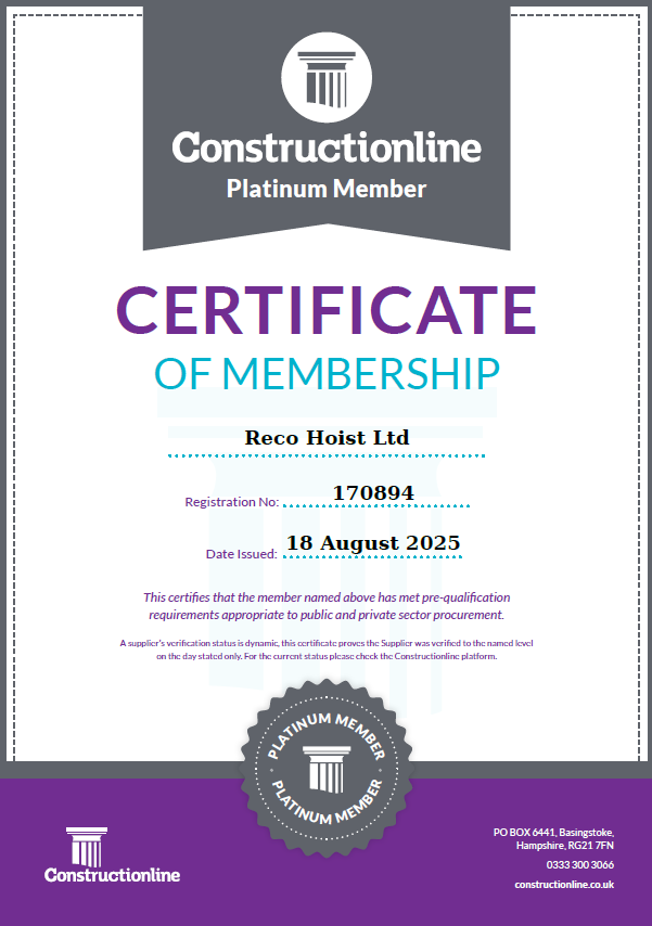 At RECO Hoist Hire & Sales we are pleased to confirm that we have once again achieved Constructionline Platinum accreditation, the highest available certification within the Constructionline framework.